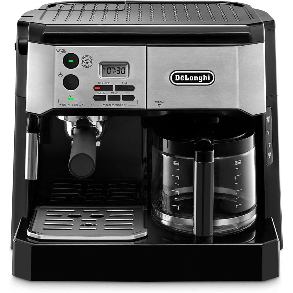 For Espresso and drip coffee lovers alike, The De’Longhi combination pump espresso/drip coffee machine, BCO430BM, offers the best of both worlds. This all-in-1 machine prepares coffee, cappuccino, espresso and even lattes to perfection using an innovative preparation system with simple steps for the at-home user. This new machine can brew two drinks at once, with a full cappuccino system on one side and a drip coffee machine on the other. It features 15 bars of pressure for drawing the most flavor and desired temperature in each cup of espresso, delivering customized, quality flavor every time. For drip coffee, It also features a frontal loading system, which allows you to load water and coffee from the front of the machine without having to move it from under the cabinet. The 24-hour programmable timer allows you to have a pot of coffee waiting for you when you want it. Experience the convenience and quality of this multitasking machine. Rated voltage/frequency (V-Hz): 115 V / 60Hz, Filter (V-shape): Permanent.