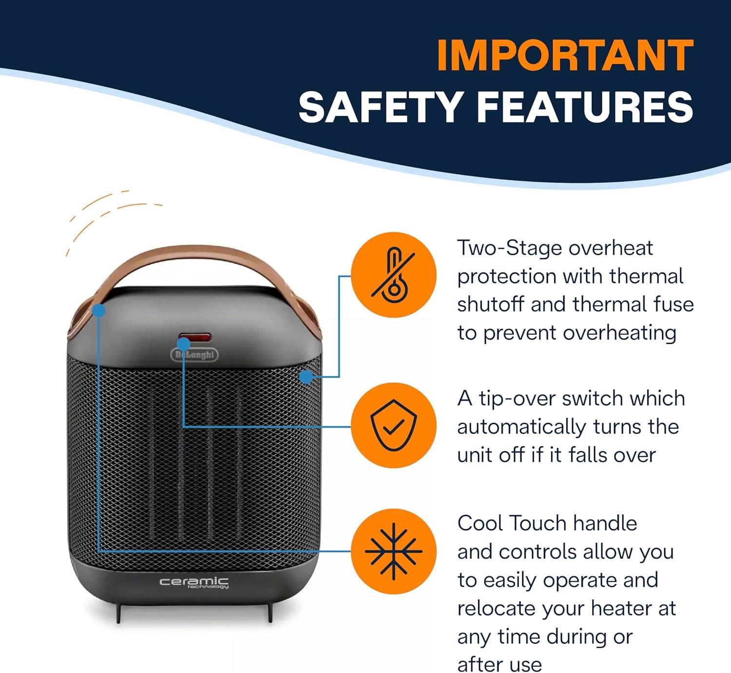 Add instant warmth to any small to medium room with the De'Longhi Compact Ceramic Heater, model HFX30C15. G. Lightweight and portable, the compact heater warms up in seconds to deliver instant, focused heat, while providing full room circulation, so there's no need to turn up the heat for your entire home. You can customize your heating needs with the adjustable electronic thermostat, 24-hour digital timer and multiple heat settings including Eco Plus to save energy. The fan only option provides relief for the warmer months. The function with thermal shutoff and tip-over switch automatically shuts the heater off if the heater is accidentally knocked over. An additional safety feature includes an antifreeze standby setting that automatically warms up the heater when the temperature dips below freezing. With all of its convenient comfort and safety features along with its compact size, the De'Longhi Compact Ceramic Heater, model HFX30C15. G is perfect for personal use wherever you need instant heat.