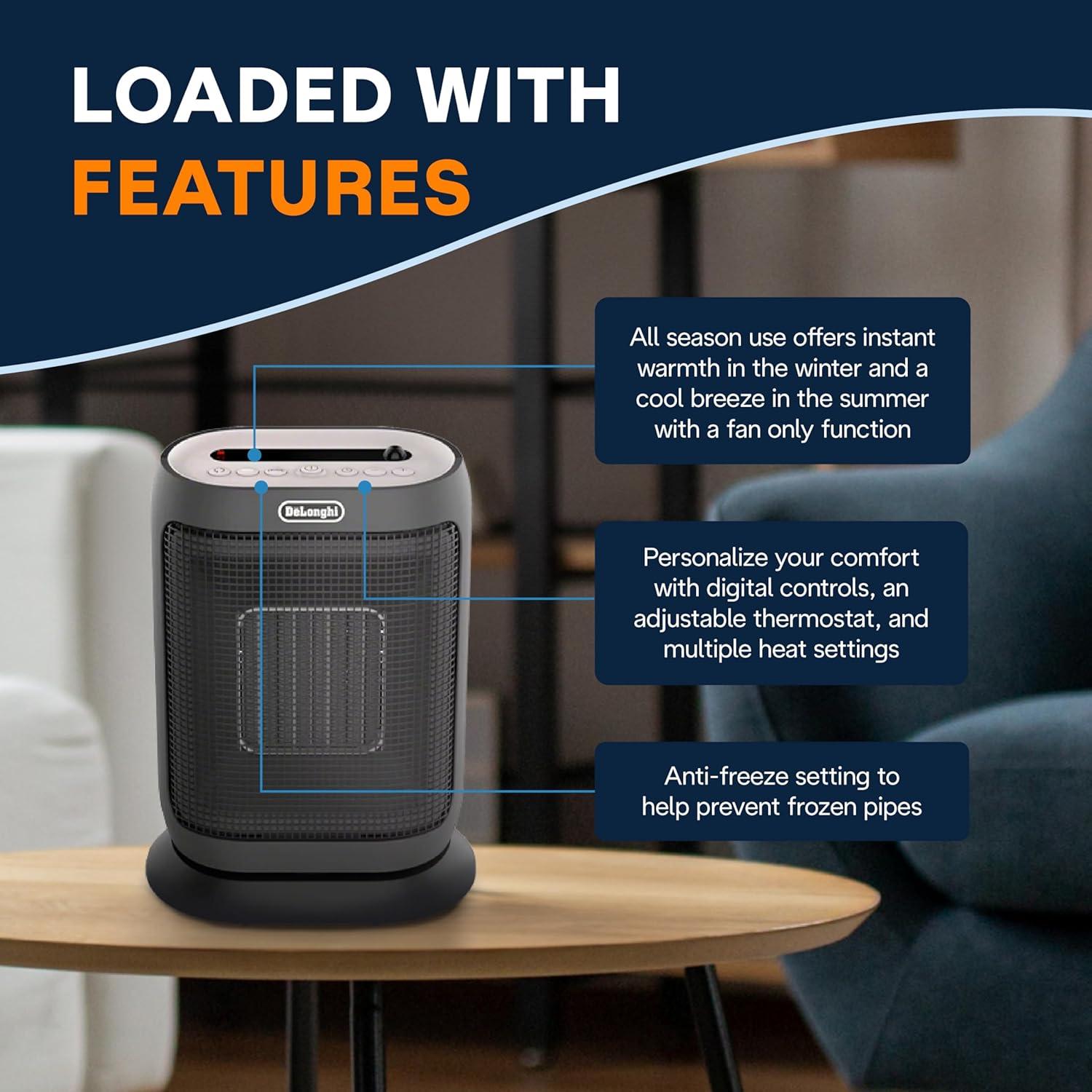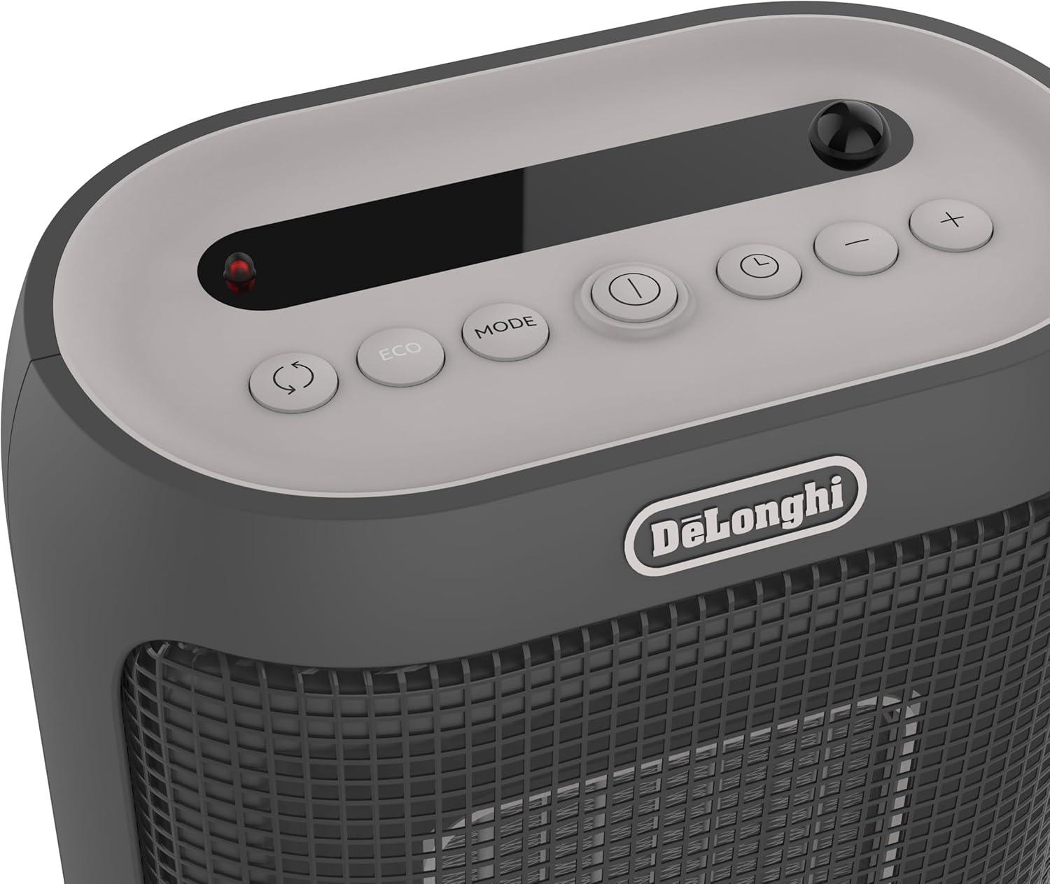 Indulge in comfort without sacrificing style with the 1500-watt De’Longhi HFX42T15GI, featuring an adjustable thermostat, 24-hour timer, remote, Cool Touch handle, and fan function for year-round use. Best for small spaces and personal comfort, this lightweight and portable heater delivers fast, even and wide-range heat. Maximize energy efficiency with our ECO function, which automatically adjusts heat and power. Built-in safety features include child lock, two-stage overheat protection with a thermal shut-off, an internal tip-over switch, and a standby setting that prevents frozen pipes.