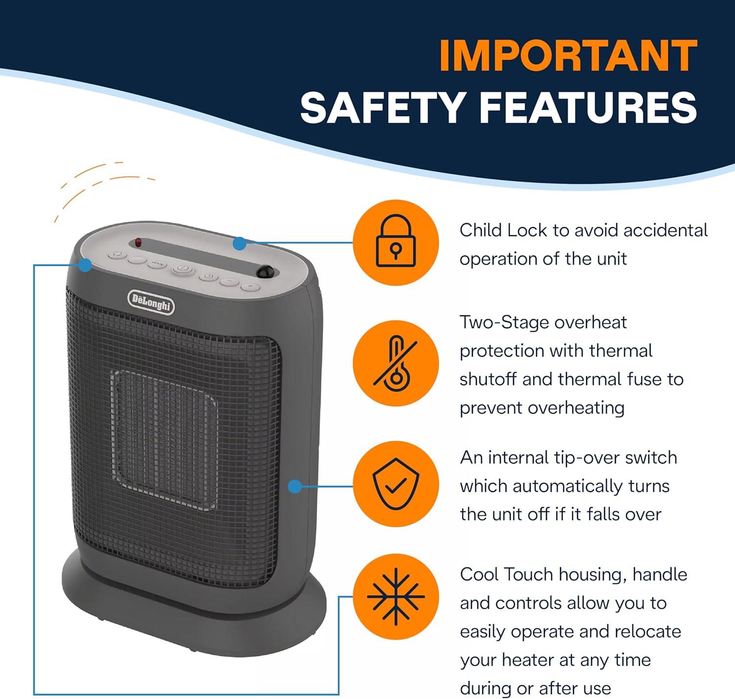Built-In Safety Features includes a child lock, two-stage overheat protection with thermal shutoff and a thermal fuse to prevent overheating. An internal tip-over switch automatically turns the unit off if it falls over.