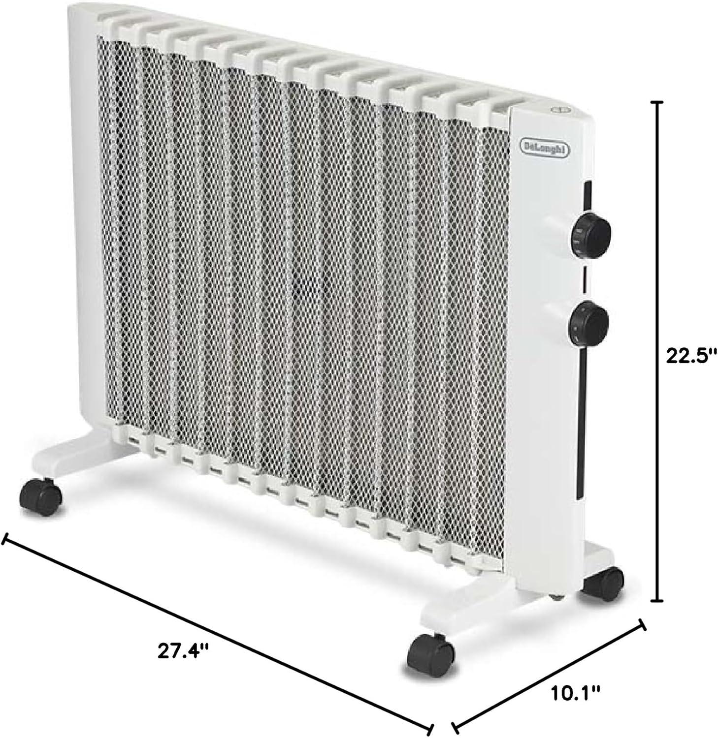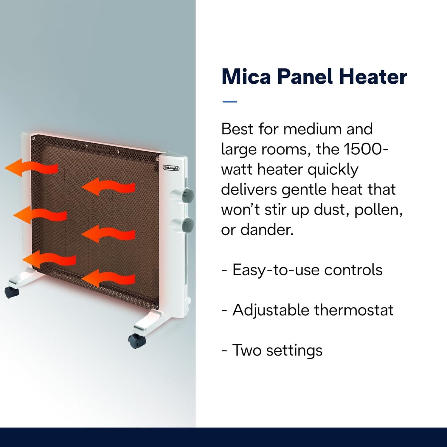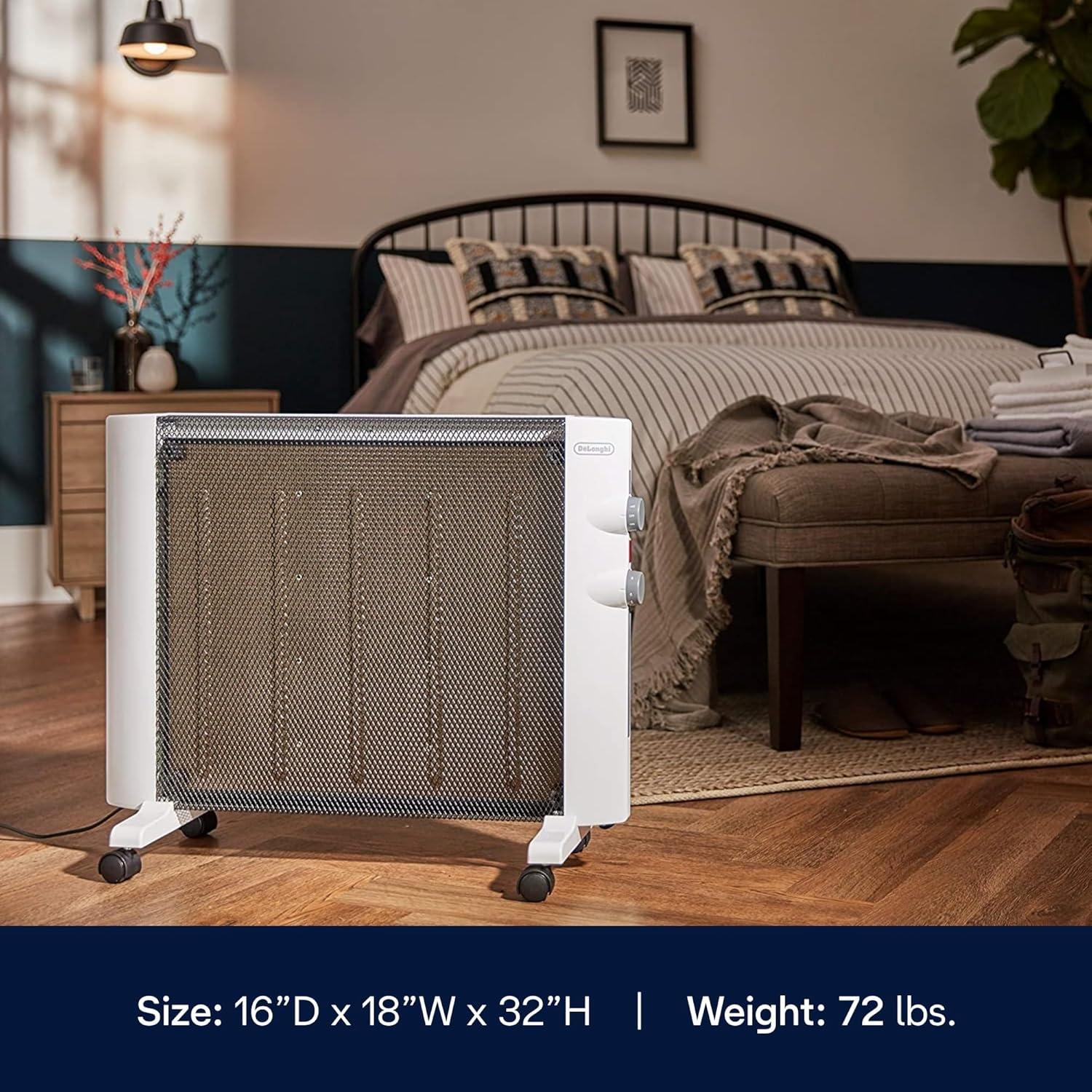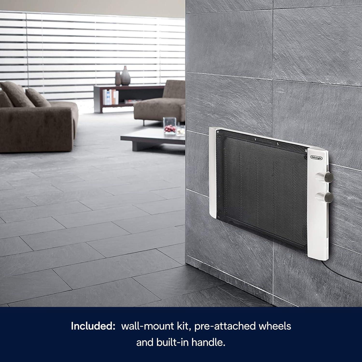 DeLonghi Mica Panel Space Heater, 1500W quiet electric space heater for indoor use, adjustable thermostat, freestanding/ easy wall mount, full room heating with built-in safety features, HMP1500 Black(White)
