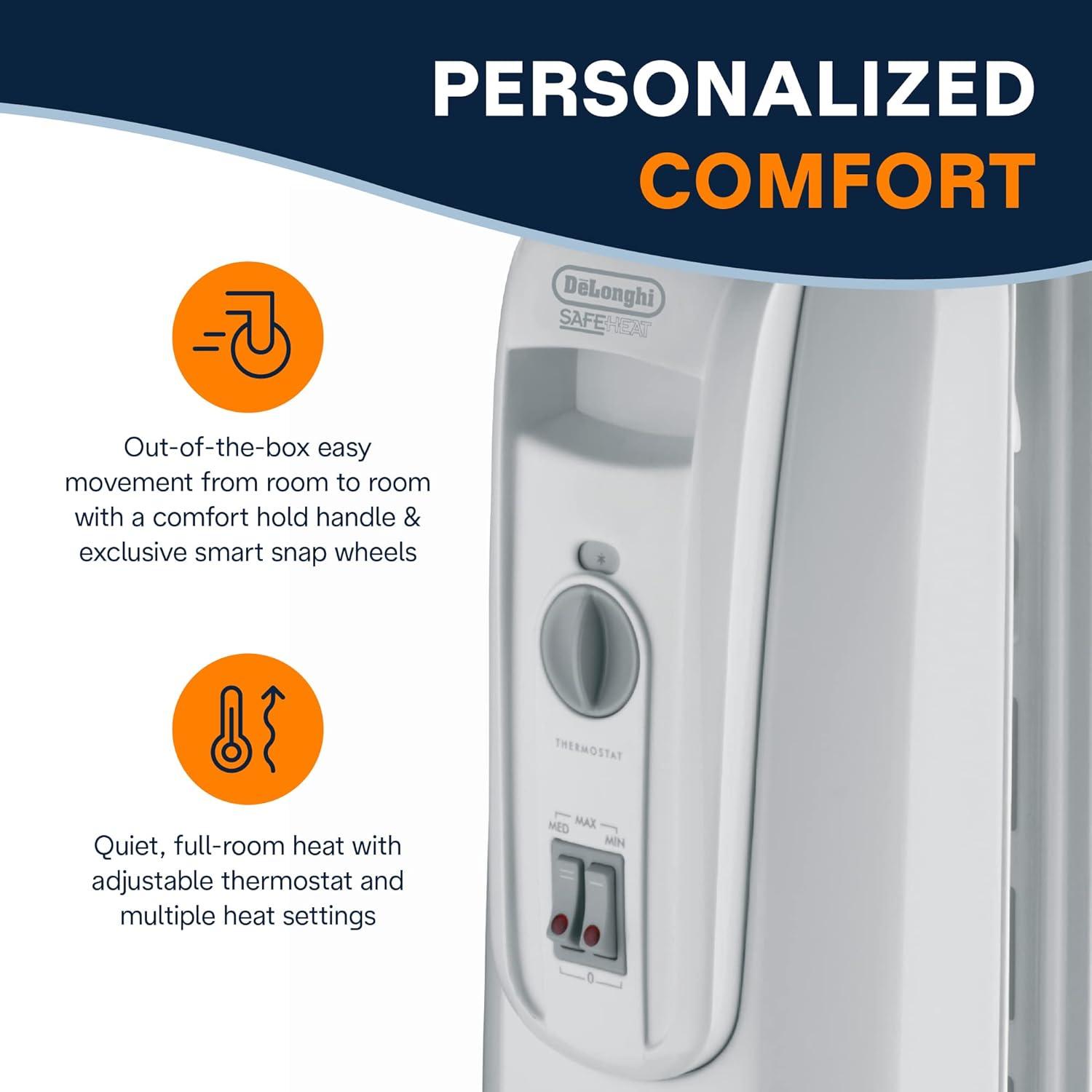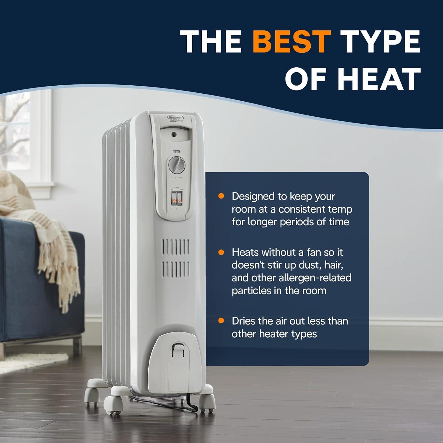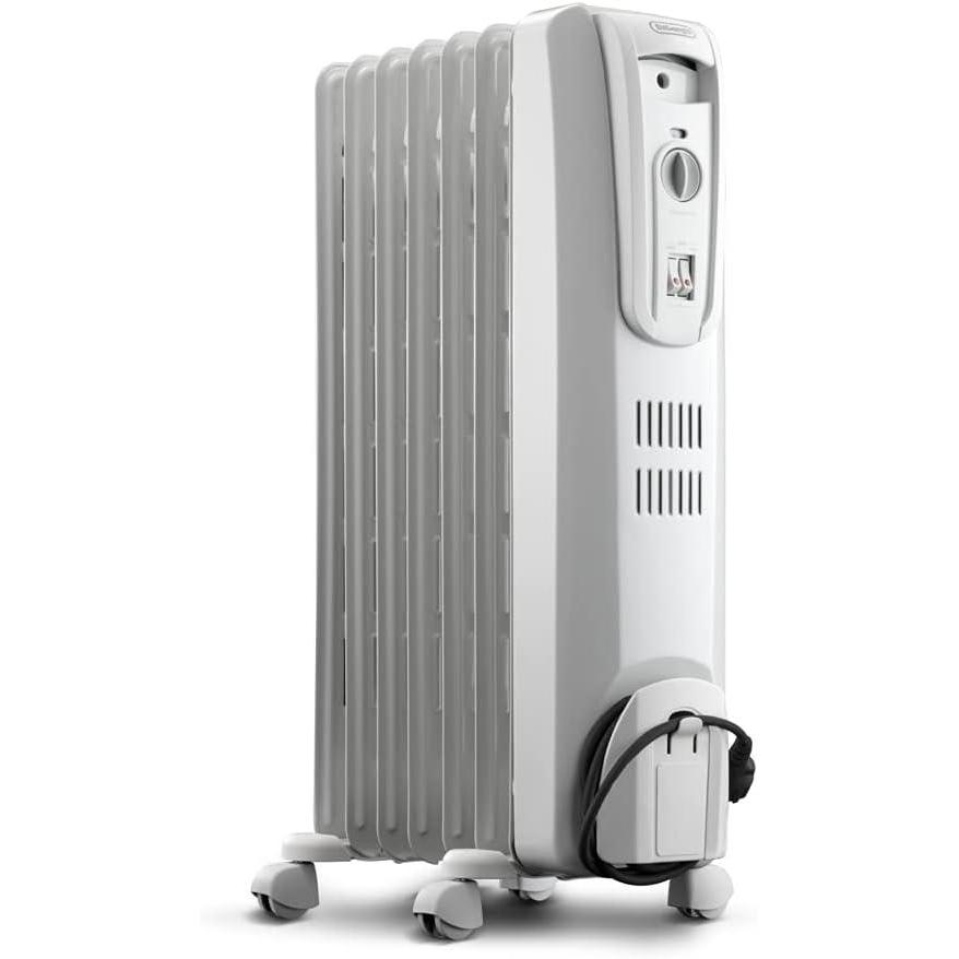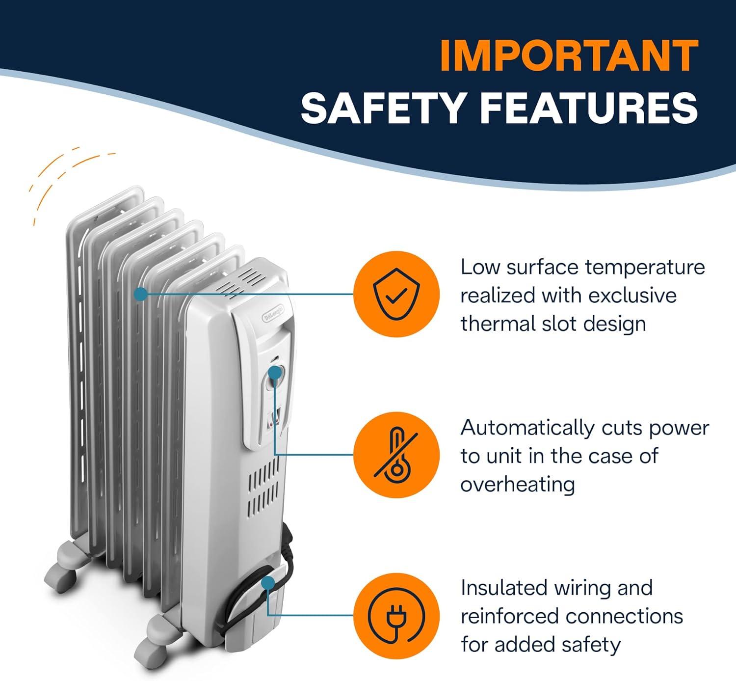 Effectively heat any room of the house with the De'Longhi portable oil-filled radiator The heater produces the maximum amount of radiant heat while ensuring a low surface temperature making the radiator a nice choice for homes with pets or kids The user-friendly control panel offers an adjustable thermostat and three heat settings to customize your heating needs and optimize energy-efficient operation The anti-freeze setting allows the unit to automatically turn itself on when the temperature drops below 44 degrees F Safety highlights include rust-resistant durable metal construction a gently rounded design and a thermal cut-off function that automatically turns the heater off if it starts to overheat With its sleek look and silent operation the De'Longhi oil-filled radiator is the perfect solution to all your heating needs.