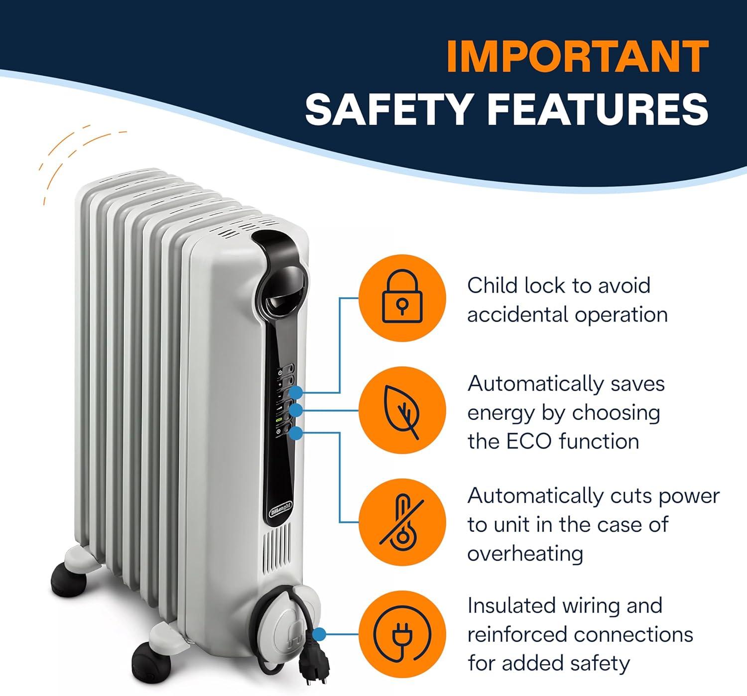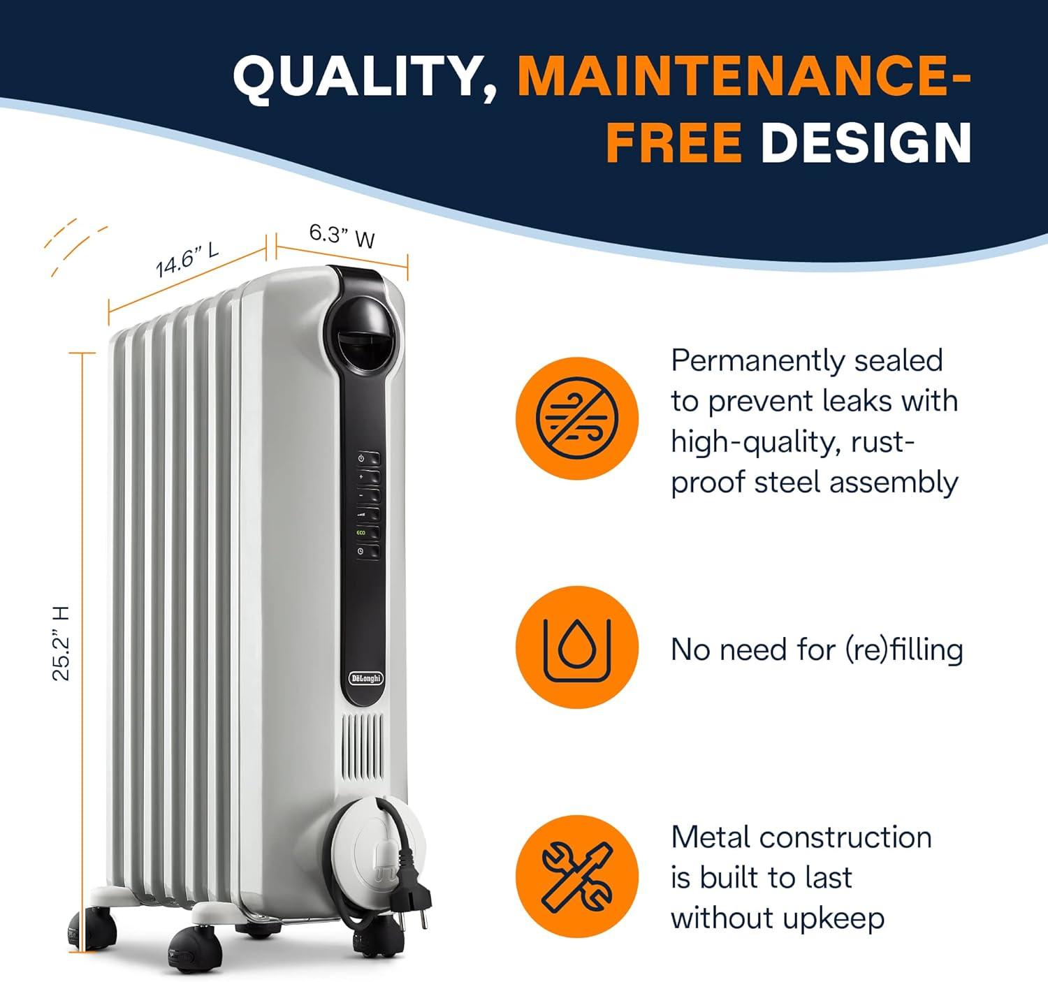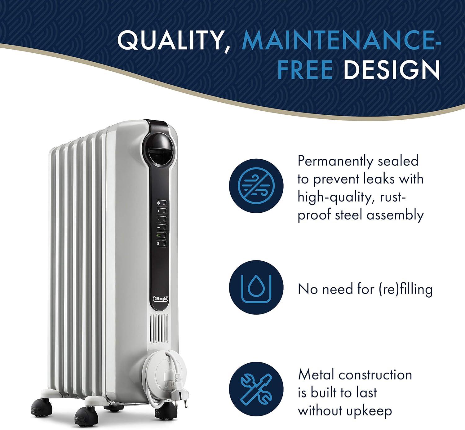 DeLonghi Radia S Oil-Filled Radiator Space Heater, Full Room Quiet 1500W, Adjustable Thermostat, 3 Heat Settings, Digital Timer, ECO Energy Saving Mode, Safety Features, Light Gray, TRRS0715E